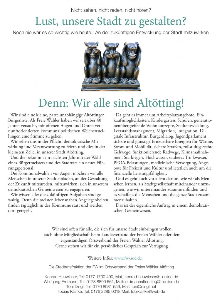 Das und noch einiges mehr bereitet uns Sorgen und deswegen können wir dem Haushaltsplan 2025 guten Gewissens nicht zustimmen, sind aber gerne bereit mitzuarbeiten, wenn es um ein sparsames Wirtschaften und um ein langfristig sinnvolles Arbeiten für die Bürgerinnen und Bürger und die Kinder und Jugendlichen Altöttings geht .